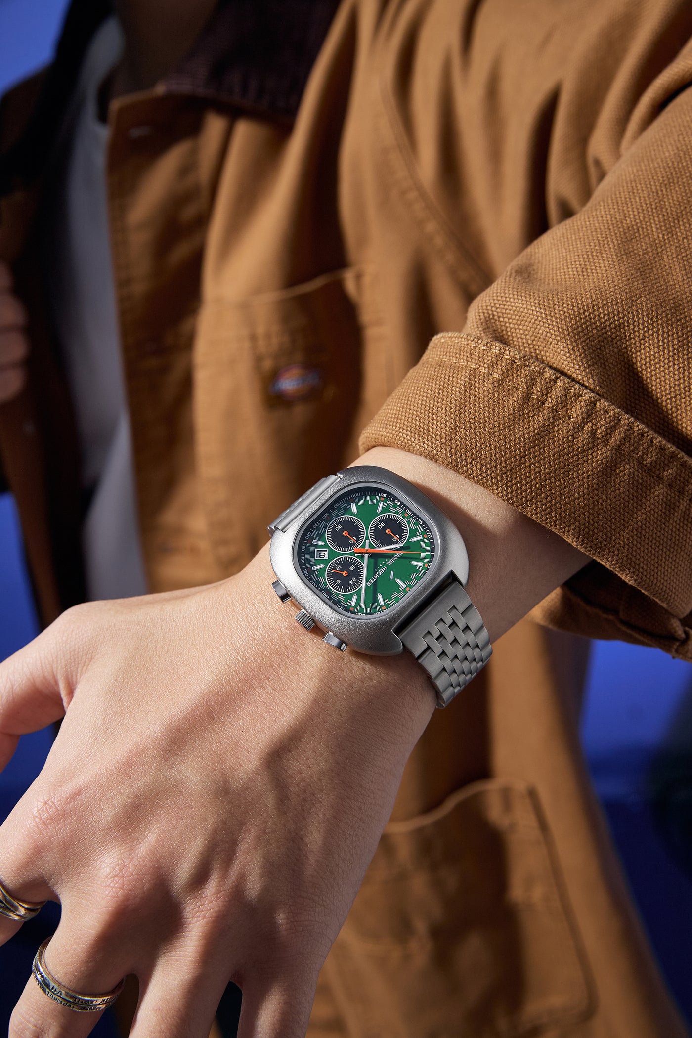 - Striking Emerald Green Dial with Chronograph Function Features a deep green sunray dial with three black sub-dials for precise stopwatch timing and a discreet date display for everyday convenience.
