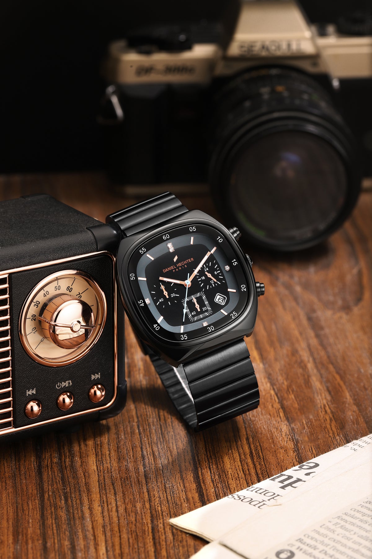 Daniel Hechter Paris men's chronograph watch with a modern cushion-shaped black stainless steel case. |